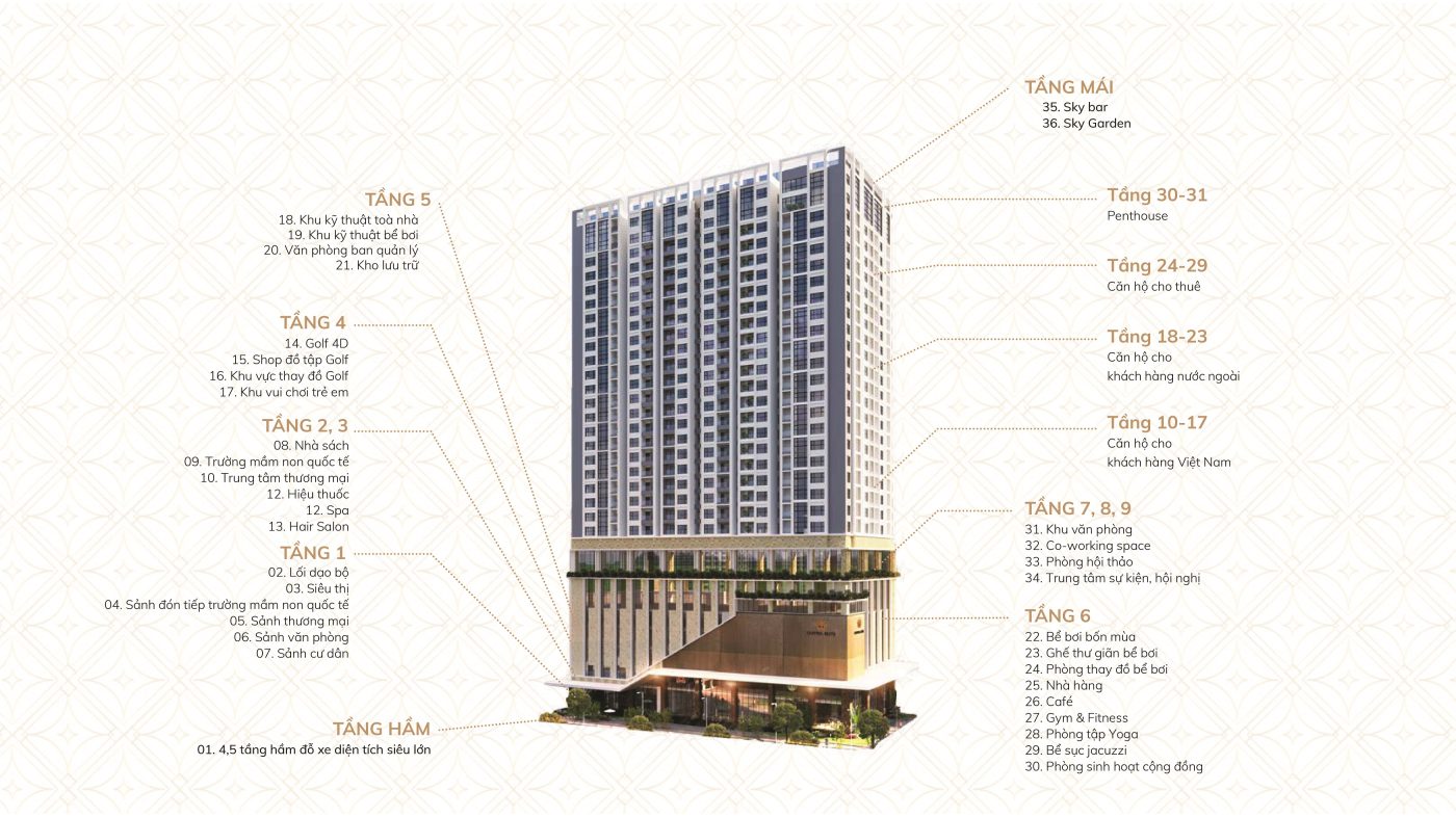 • Tầng 1 – 9 được sử dụng để xây dựng khu trung tâm thương mại và văn phòng, cung cấp cho cư dân tất cả các dịch vụ và tiện ích cần thiết như siêu thị, trường mầm non, bể bơi, cửa hàng tiện lợi, nhà hàng, quán cà phê, phòng tập gym, spa, trung tâm y tế, văn phòng…