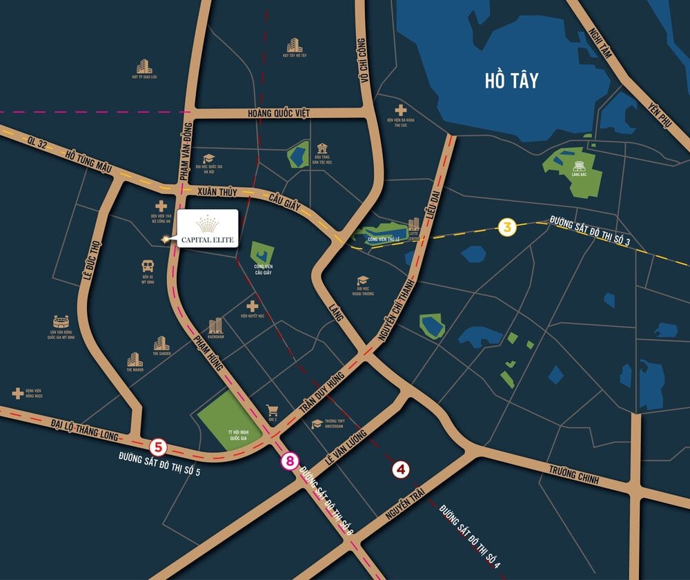 Nằm ngay tại vị trí trái tim khu “new CBD” – thủ phủ kinh tế mới của Hà Nội, Capital Elite cũng kết nối nhanh chóng với những khu vực khác của thành phố qua các tuyến metro 5, 6, 7 trong tương lai.